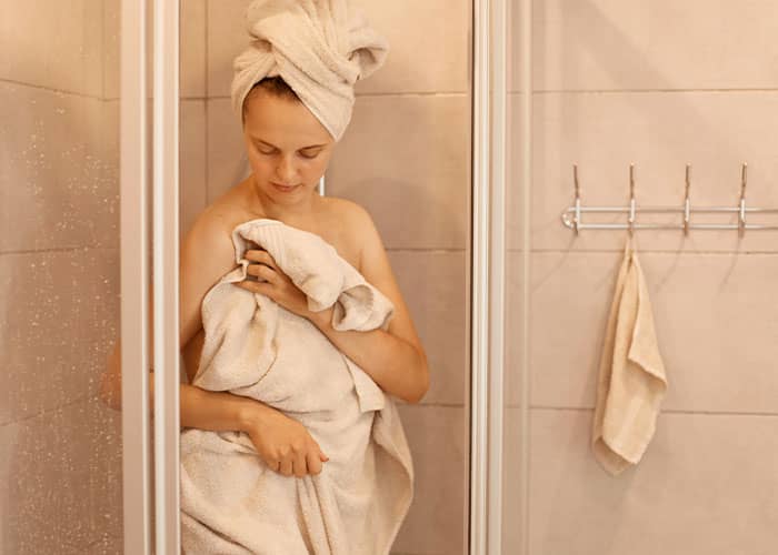 When they wear the towel on the head after the shower the hair is all up in the twisty thing sticking straight up on the top of their head. I discovered this when I tried to joke around and grab the towel by the twist off my gfs head and sent her flying. I felt so bad. And yes, I’m stupid.