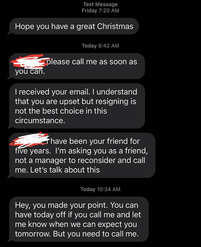 With deadlines approaching and having nothing to show their clients, their angry manager started bombarding their phone with calls and messages, trying to manipulate the employee to return “for the team.”