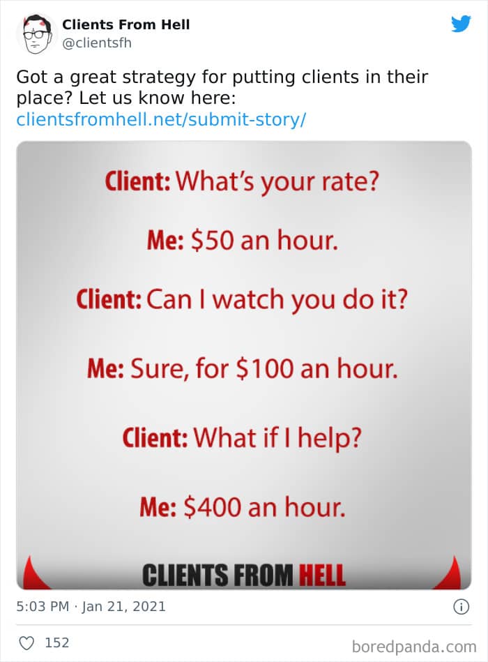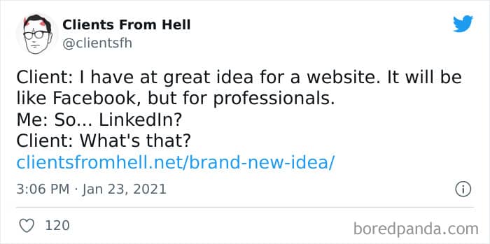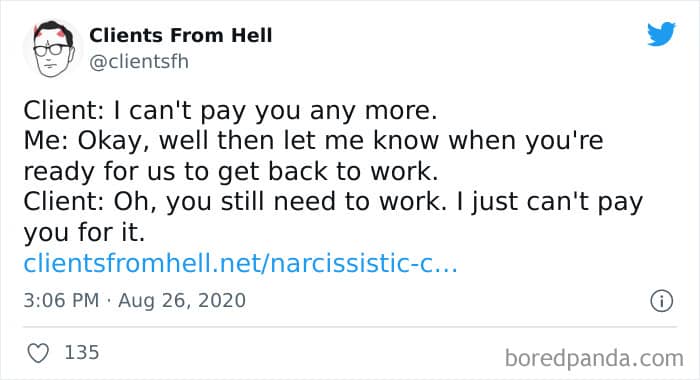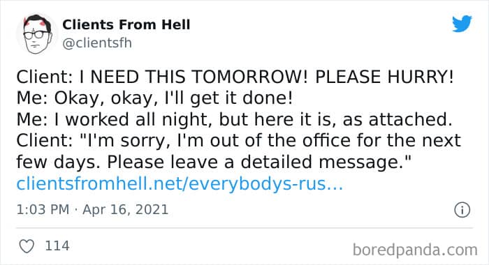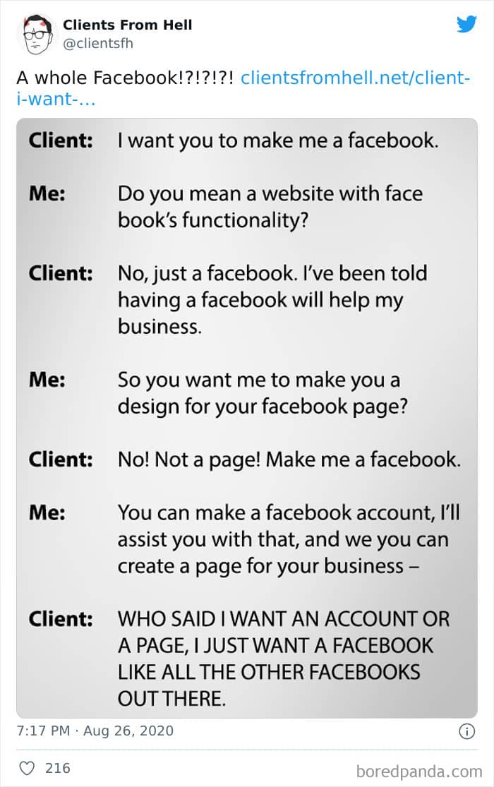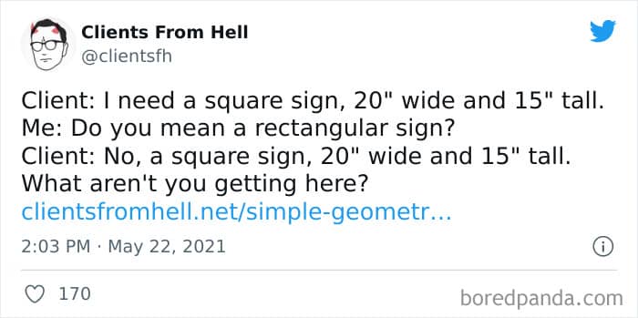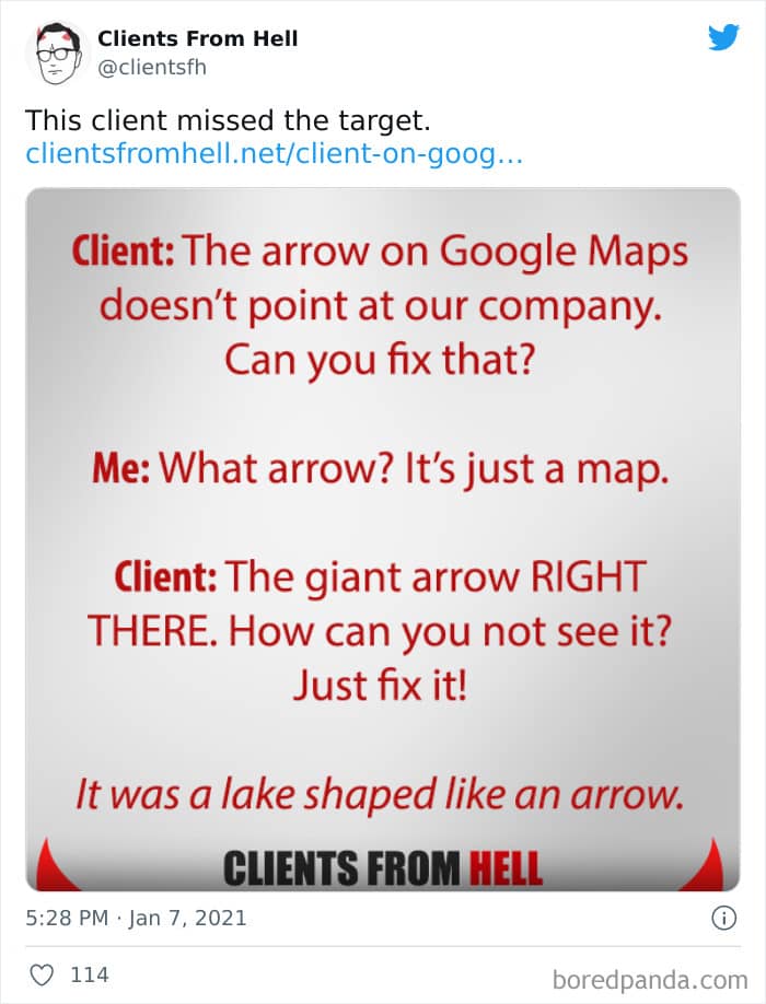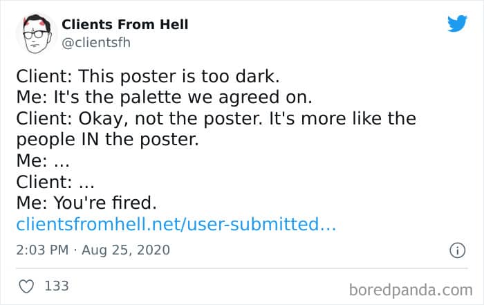 The ‘Clients From Hell’ online project moved to ‘Not Always Right’ in mid-December, 2021. Founded way back in 2009, CFH, by their own admission, wasn’t getting the audience that it used to. So, in order to revitalize things, they rebranded. The CFH Twitter page has over 81.1k followers, while the NAR Facebook page has over a quarter of a million followers.