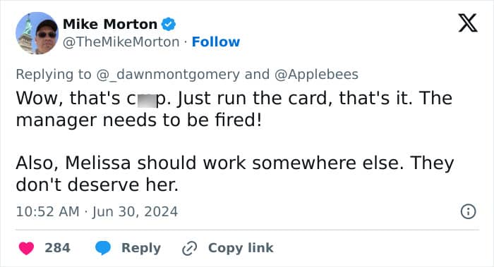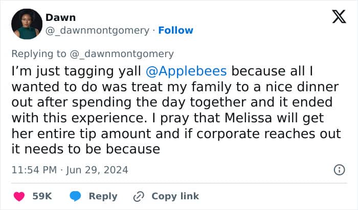 The poster was enraged by the incident and felt that the manager might have been racist for creating a scene about the money. She also observed and heard that other waiters refused to wait on their table just because they were black. Dawn tagged Applebee’s in her tweets to make sure corporate would know about her experience and also give Melissa the full tip.