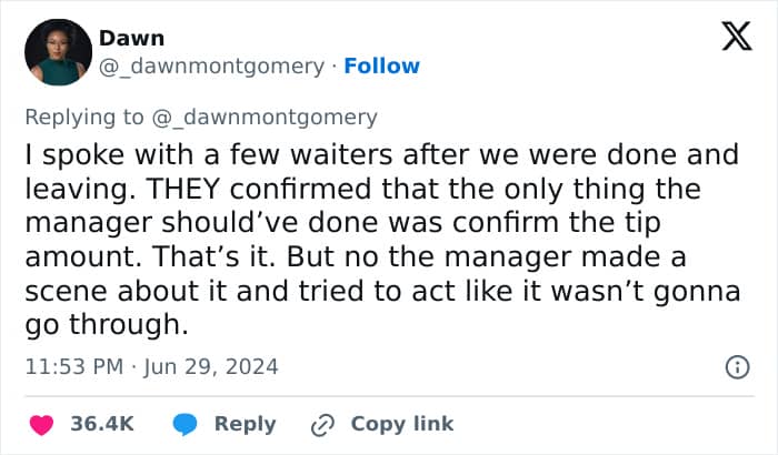 The manager said that he would have to call corporate and confirm if they could “accept the tip amount,” which is why he also made Dawn sign the bill and leave her contact information