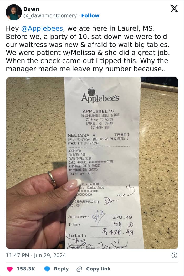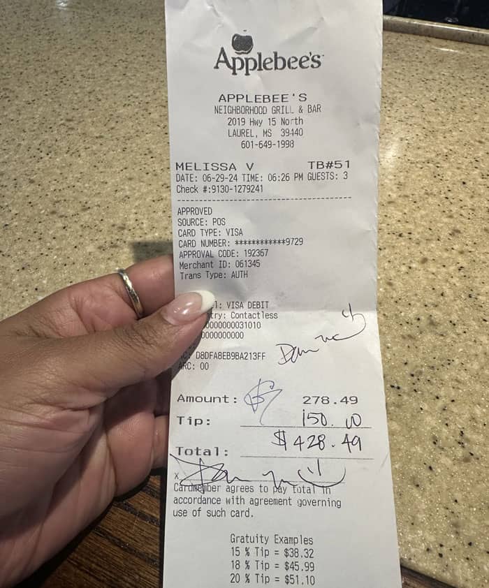 Before they even sat down to eat, Melissa, the waitress, shared that she was new and anxious about waiting on a large group. Dawn’s family was patient with her, and she decided to leave a $150 tip for Melissa. Usually, businesses love it when customers leave tips for their waitstaff since it helps them get away with not paying their employees well. But this time, the Applebee’s manager had a lot to say.