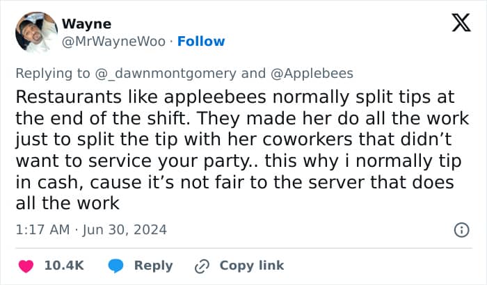 One interesting thing that folks pointed out about Dawn’s situation was that she paid the bill and the tip by card. According to CardFellow, “Tips added after a card is authorized may not be accepted by the card issuer, especially if the amount exceeds 20% of the original transaction. This means that there’s a potential risk for the restaurant if the bank declines the additional tip amount, leaving them on the hook for the difference.”