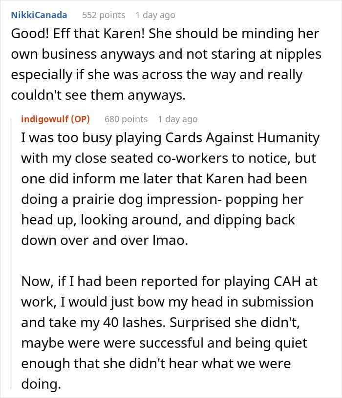 Everything started when Indigowulf’s coworker, who she dubbed Karen, tried to get her in trouble with HR and told them the woman was looking too provocative and violating the dress code.