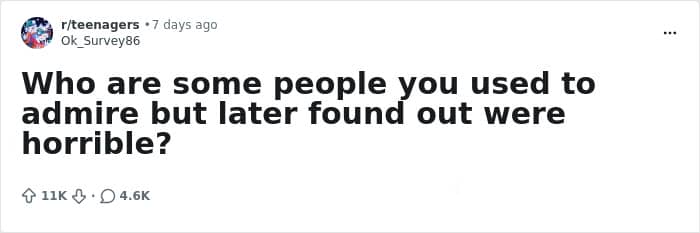 Someone asked “Who are some people you used to admire but later found out were horrible?” and people shared their examples. So get comfortable as you scroll through, upvote the examples that maybe hit a bit too hard to home and be sure to add your own thoughts in point to the comments down below.