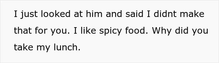 A longtime coworker secretly took the food without permission and ate it, unaware of how spicy it was
