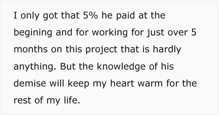 The man also mentioned that, in terms of money, he was only paid 5% of the whole amount, as the client “protected” himself by saying that if the OP couldn’t honor the contract, why should he pay? Finally seeing this man’s toxic traits, the author then decided to secure himself by adding a special function to the code.