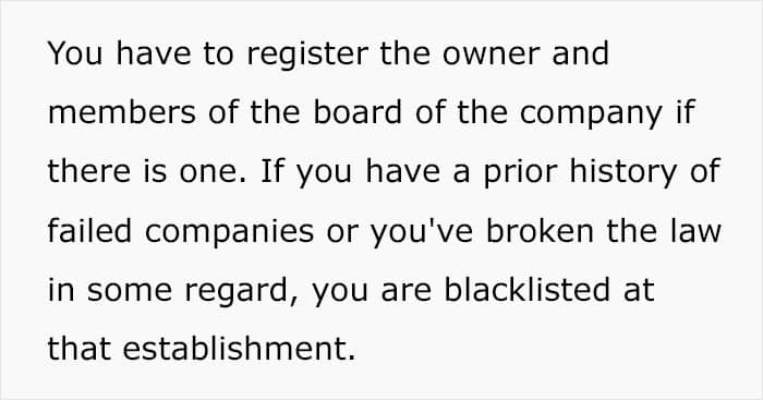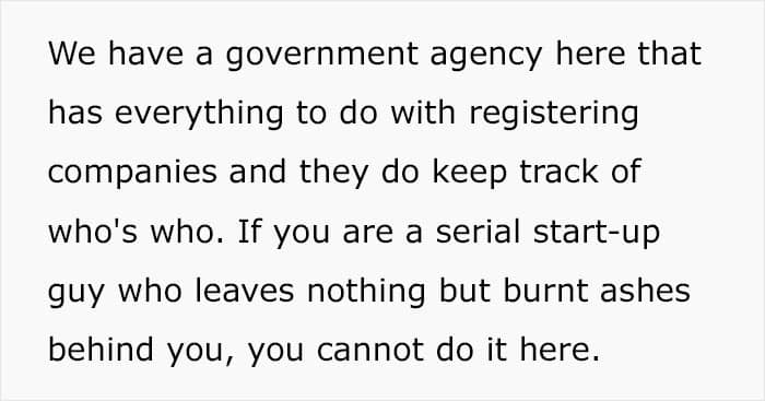 The freelancer then edited his post to let the readers know that he’s from a small country in Europe with different laws and regulations. You’re obliged to register whenever you’re starting up a company, as there is a government agency that keeps track of everything, so if you break a law or have a former history with failed companies – you’re automatically blacklisted.