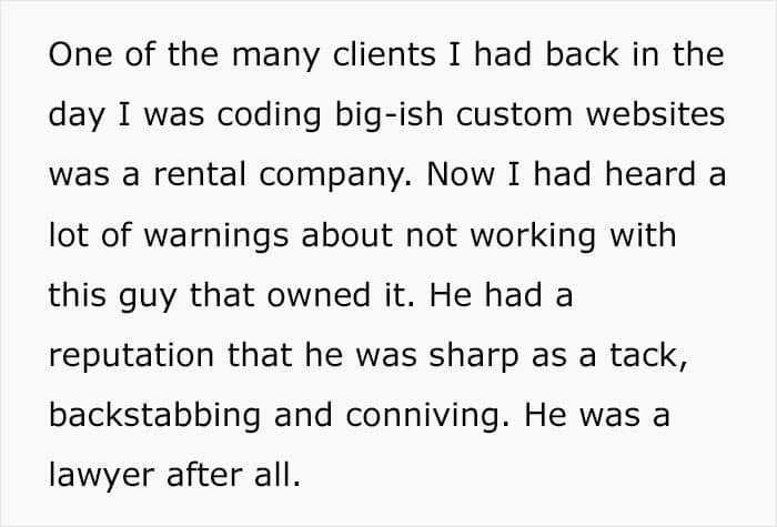 This online user decided to take it to one of Reddit’s communities to share a story about his experience with a client known for his sketchy reputation. Despite deciding to proceed with the contract, he managed to protect his dignity from this backstabbing lawyer by simply adding a special function to one of the codes.