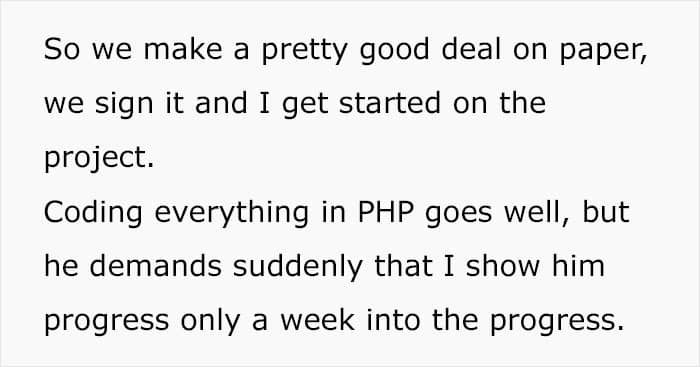 Both of them made a decent deal and the OP finally started on his project, when suddenly, the client decided to ask the freelancer for some progress, though the man had only been working on the website for approximately a week.