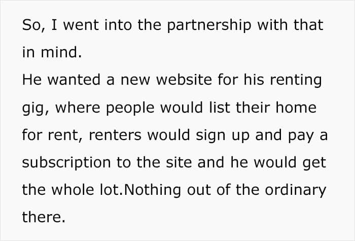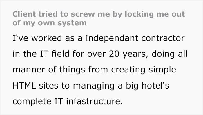 The author began his story by giving the readers some background on himself. The man has been an independent contractor for over 20 years and specializes in IT; he has managed to collect an array of experiences and is now a true master of his craft.The terrible client that this whole story is based on asked the OP for a website for his renting company. The author revealed that he, in fact, had heard a lot of unpleasant things and was even advised by his fellow IT folks not to get involved with him.