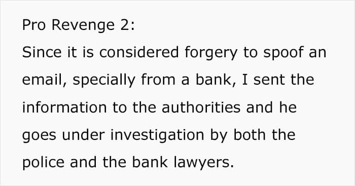 Moreover, since it’s considered to be a criminal offense to forge documents, especially the ones from a bank, the freelancer contacted the authorities and the client went under investigation. The OP then mentioned that he sold the project to the ex-client’s competitor for a much better price, and that the fishy client had since been blacklisted from owning a company and has lost all his rights to be a lawyer. Though the author only managed to get 5%, he was very satisfied with the outcome.