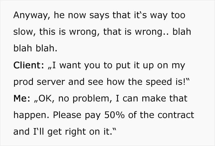 At the demonstration, the author could tell that the client was, in fact, happy, though he wouldn’t admit it, and instead decided to throw in some negative comments about things being wrong. Naturally, the thing that we all expected started to happen, and the client asked the freelancer to put the website up on their production server to see what the speed would be like. The OP agreed, but asked for 50% of the contract.