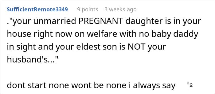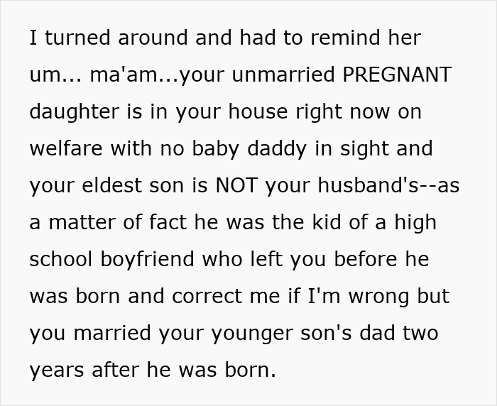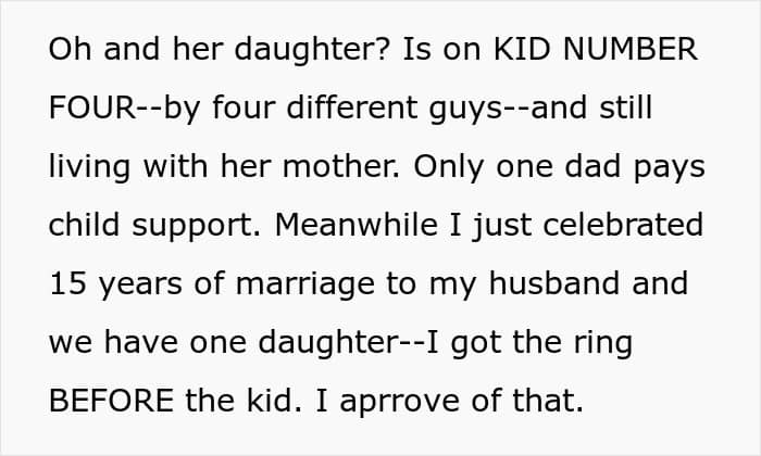 This made the OP lose it – who does this woman think she is that she can tell her what to do? Not to mention the fact that she doesn’t even live according to these morals herself. You see, her sons are problematic, her daughter, who lives at home, has a child out of wedlock with a deadbeat baby daddy. And that’s not even all of it – the timelines of the woman’s child births also suggest that they were conceived before marriage, too.