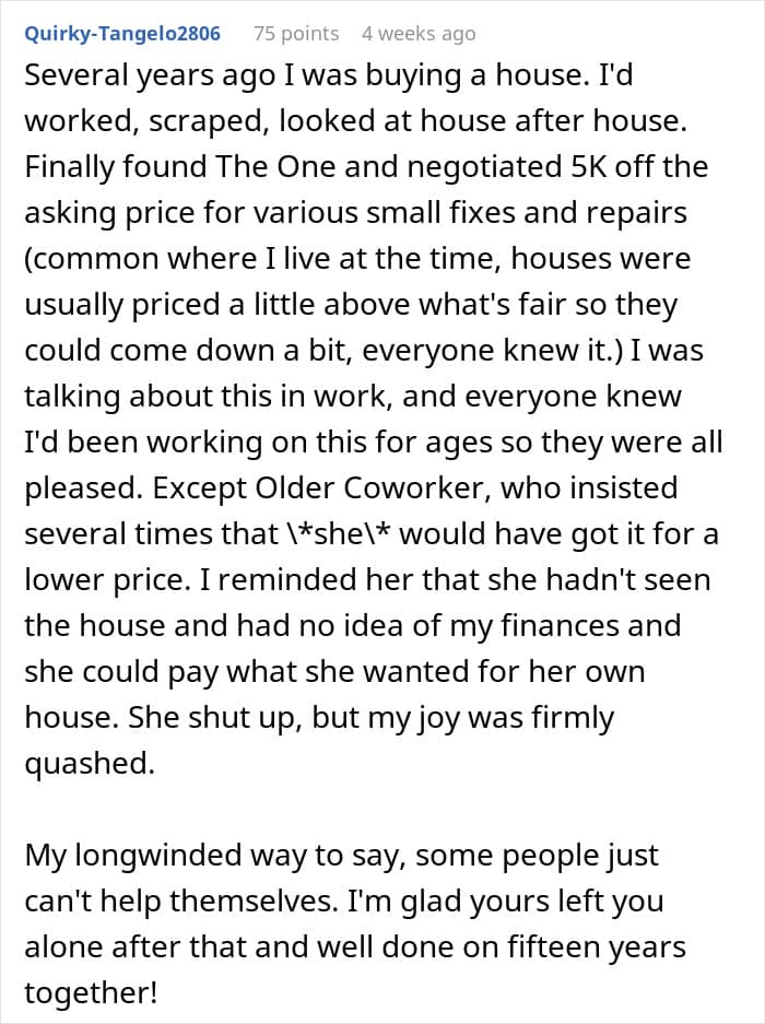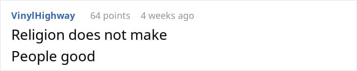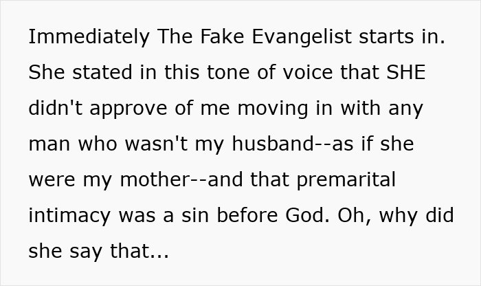 So, she chose to use this “power” to tell people, especially younger ones, how to live “godly” lives. The original poster wasn’t excluded from this equation either. When she mentioned to coworkers that she’ll be moving in with her boyfriend of 3 years, this woman decided to jump in with her judgment.