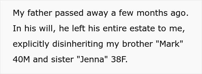 When their father passed away, the original poster (OP) thought the hardest part would be the grieving. Instead, the real drama began at the reading of the will. The dad had left his entire estate to OP, clearly disinheriting their two siblings, Mark and Jenna. Turns out, 10 years back, Mark and Jenna each got $150k as an advance inheritance.