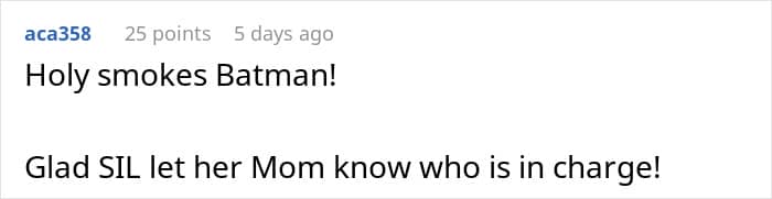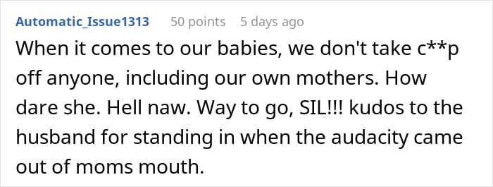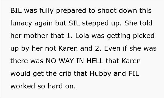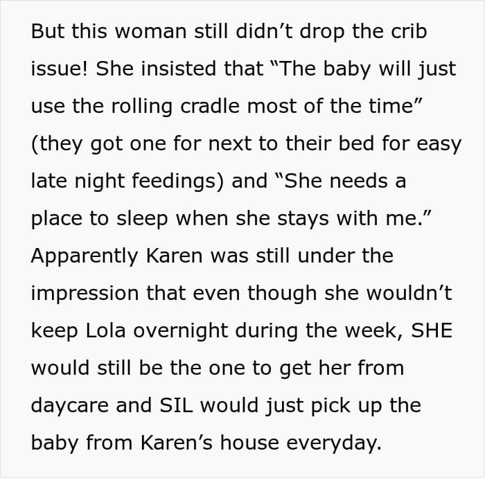 At first, Sandra was stunned into silence, being a bit of a “pushover,” as the OP would call her. But when Karen doubled down, she finally unleashed her inner mama bear, shutting down the idea of Karen picking up Lola from daycare. Then, she channeled her inner Beyoncé and put her foot down about the crib, telling her mom to buy her own. Honestly, good for her. I would have probably done the same thing.