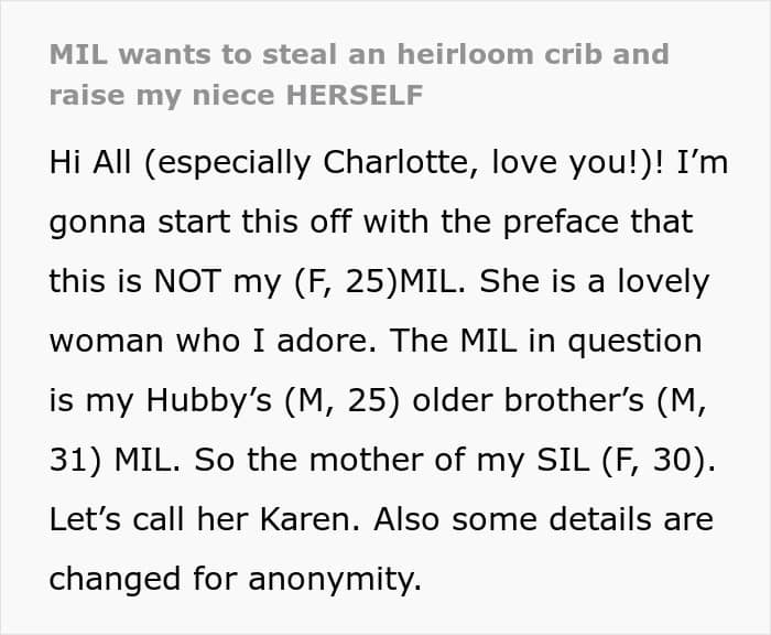 When Sandra and Bill announced they were expecting a baby, the OP’s husband and father-in-law crafted a stunning $3k-$5k crib, which would become a family heirloom, meant to cradle not just baby Lola but all future grandkids. It was a labor of love, meant to be passed around the family like a cherished treasure. Karen, however, saw it as her ticket to permanent grandma glory.