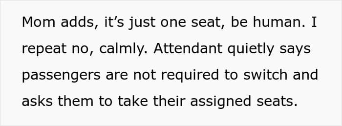 The father wanted OP to switch her premium seat for a middle spot near the bathrooms. When she politely declined, explaining she’d paid for comfort and sleep before a work event, the family acted as if she’d personally ruined their vacation. The flight attendant backed her up, but the drama was only starting.