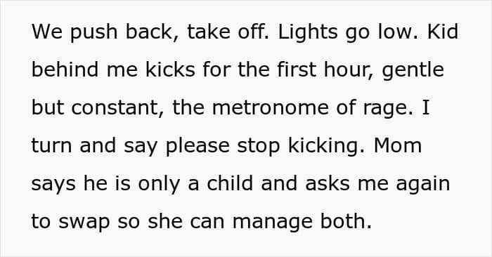Mid-flight, the mom began filming her “adorable” child playing racing cars on OP’s armrest. When OP asked her to stop recording, the woman huffed like OP’d threatened her kid. Then came the endless kicking from the seat behind her, followed by a passive-aggressive remark about “single women not understanding family life.”