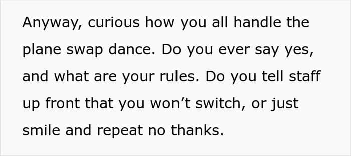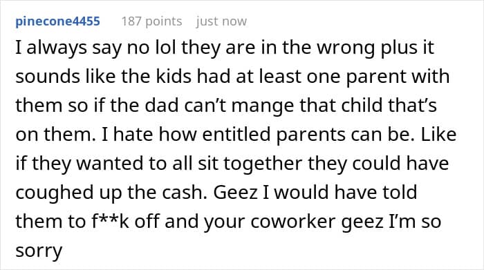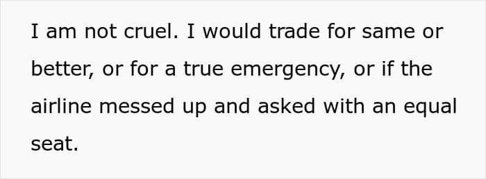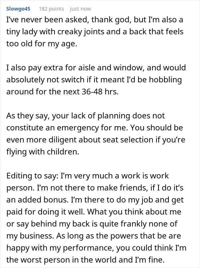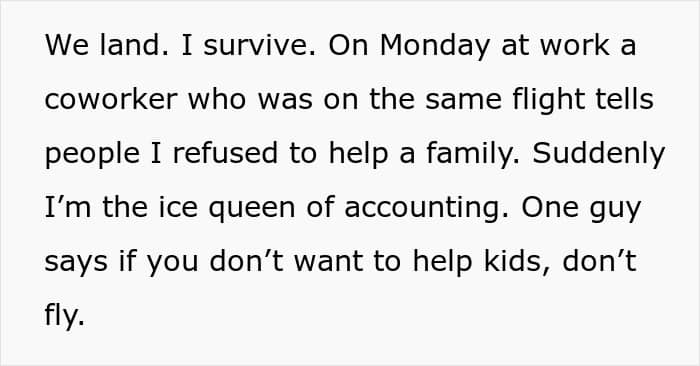 After surviving the journey, OP faced round two: office gossip. A coworker from the same flight told others she’d refused to help a family, earning her the nickname “the ice queen of accounting.” But OP stood firm; she paid for that seat, needed rest, and wasn’t about to sacrifice her comfort because someone else hadn’t planned ahead. Annoyed, she turned to netizens to find out what they thought of the whole seat-swapping mess.