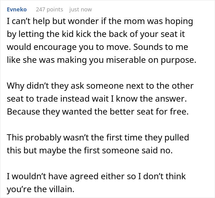 Good thing OP didn’t cave to the cabin pressure those parents tried laying on her. She would’ve spent the entire flight in a terrible position, all because some entitled folks thought “But we’re a family!” was the ultimate trump card. But how do you actually say “No” to someone trying to snake your seat? And are airlines doing anything about chaotic kids mid-flight? We went digging for answers.