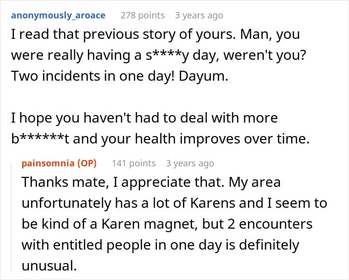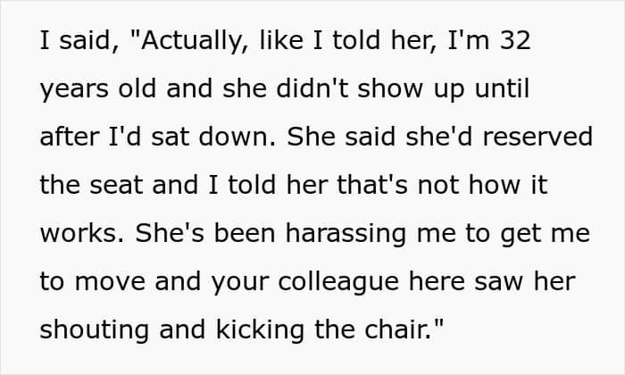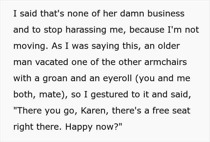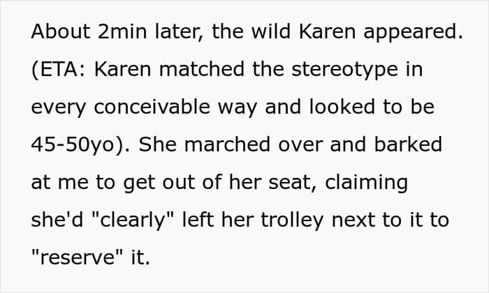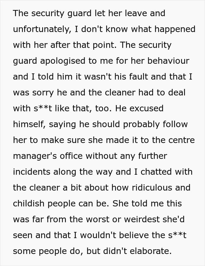 Even worse, from her point of view, this was a child, so to a third party, it would look like this woman was attacking and cursing at a teenager who was just sitting in a chair. Unfortunately, none of the folks around stepped in and did anything until staff got involved. While it’s a bit cowardly, many people do not want to deal with a delusional person willing to attack someone in public. A lot of entitlement could perhaps be solved just by treating them more firmly.