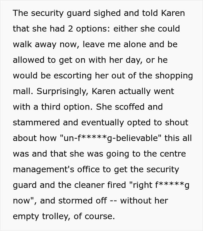 Which is exactly what we see here, the security guard gets involved and the Karen is forced to retreat. We don’t get any follow-up about her, but it’s safe to surmise that the manager told her the same thing, that she should probably drop it. While we don’t know for certain, most malls do have, for example, cameras, and it would be very easy to find out if she was lying.