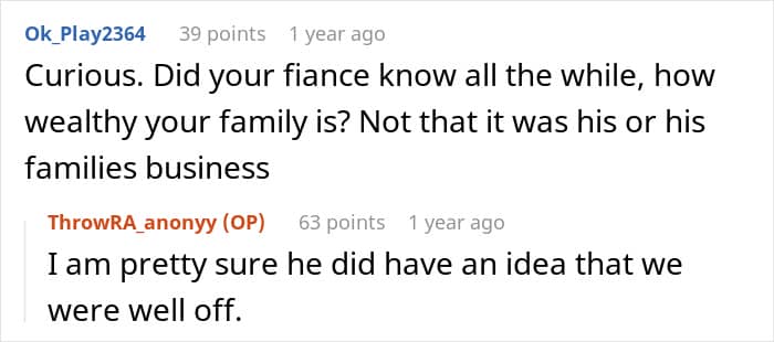 The poster was from a wealthy family, but never showed off her wealth, unlike her fiancé and his family