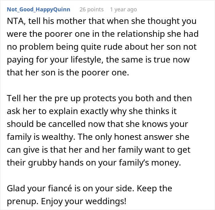I definitely agree with Redditors that she should keep the prenup. Many also wondered about her fiancé’s take on it. OP clarified that he had her back 100%, and he was not really close with his parents. Well, I truly hope she was able to overcome the whole in-law issue before the big day, and was able to enjoy it. What about you? Leave your thoughts in the comments!