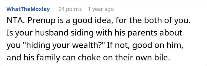 It seems like the groom’s family, especially OP’s mother-in-law, lacks this basic sense of empathy. At a time when the poster required more peace than ever, she was being harassed about “hiding her wealth.” Netizens were quick to point out that the real gold diggers in the story were her in-laws. They didn’t want her to take their “wealth,” so their son shouldn’t be able to take hers either.