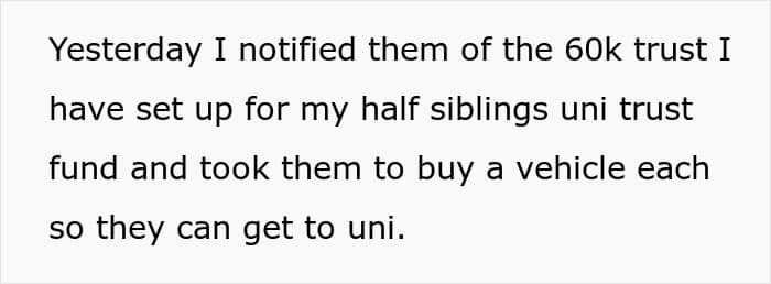 The next day, the OP revealed she had set up a $60,000 university trust for her two half-siblings, and even bought each of them a new vehicle to help with their studies. She left the price tags in full view so her stepfather could see, but he exploded and called her “disrespectful” before accusing her of showing off. This then left her wondering if what she did was indeed wrong.