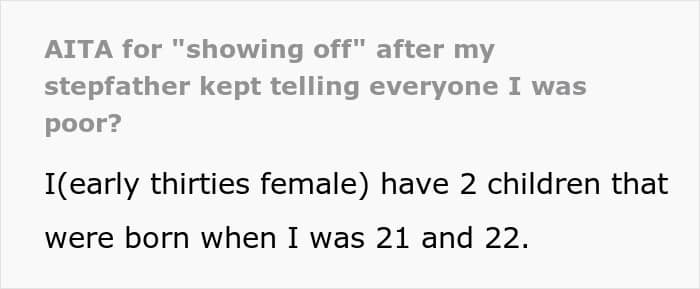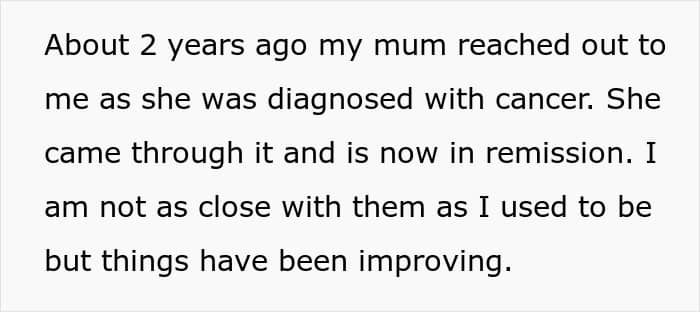 The OP’s stepfather had always been against the OP’s choices ever since she had her kids at a very young age, claiming that she was ruining her life. Ironically, this came from the same man whose gambling habit once chewed through her mother’s savings. The OP eventually cut off contact with her family until a few years later when her mother was diagnosed with cancer, prompting a fragile reconnection.