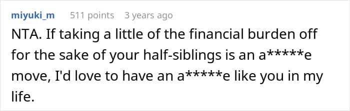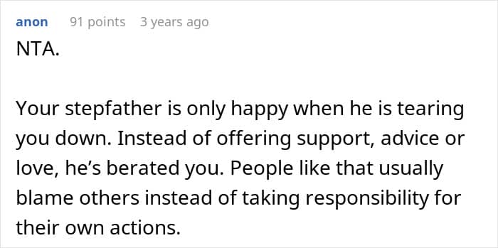 Netizens sided strongly with the OP, praising her generosity toward her half-siblings and condemning her stepfather’s behavior. They emphasized that she was completely justified in her actions and highlighted the empowerment and satisfaction that came from standing up to a critical family member.