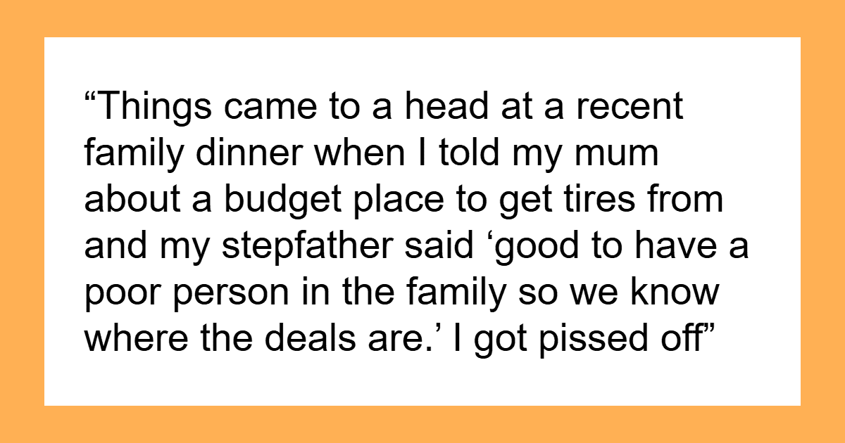 Things then boiled over at a family dinner. While giving her mom a practical tip on where to buy affordable tires, the OP’s stepfather sneered that it was good to have a poor person in the family so they could know where the deals were. At that point, the OP decided she’d had enough and left with her kids.