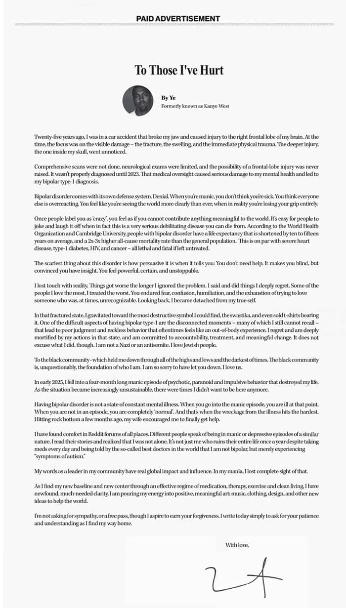 In January, the Stronger rapper issued a public apology for his erratic and discriminatory behavior, which included praising Adolf Hitler and selling sw*stika T-shirts.