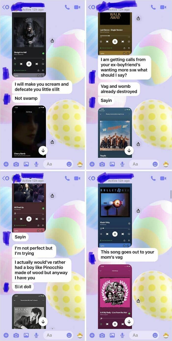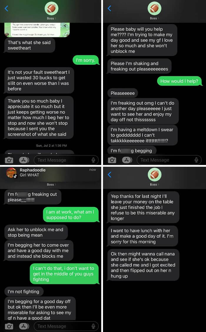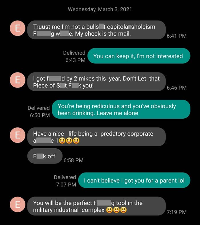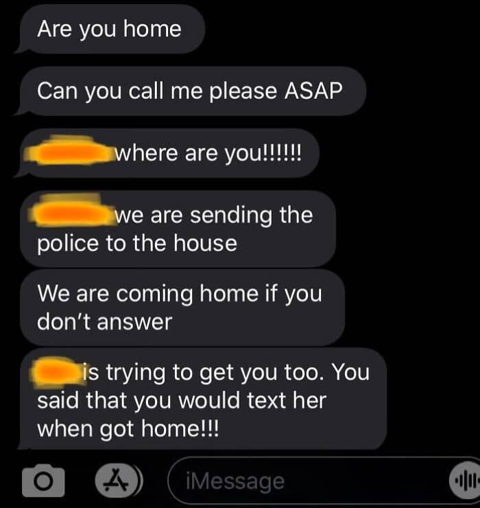 Luckily my husband’s family are cops/ex-cops and military, so they knew how to handle the situation. And no, no one tried to attack him. Cops did end up coming to get him off-site. He sent that text after they came. Was blocked instantly.