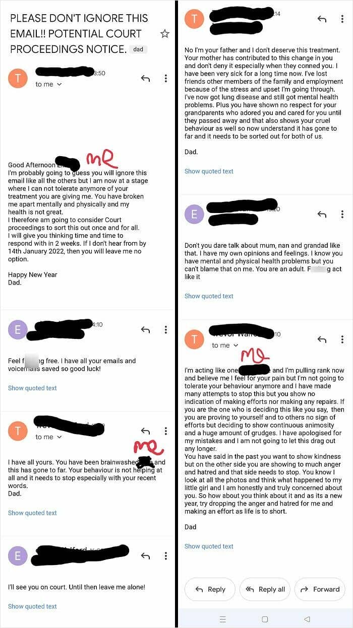 I’ve been dealing with depression for 4 years due to his emotional abuse and finally turned old enough to refuse to visit my dad’s house on the scheduled weeks. I’ve been living with my mom full-time and am trying to seek treatment, but my dad (and his girlfriend) have decided they would prefer to go to court to prevent me from getting treatment. He tells anyone who will listen that my mom left him for a woman and is sleeping around, and that I have NPD inherited from her. Meanwhile, in reality, she left him because he abused her so badly that she’s been sick— vertigo, chronic pain and MCAS— for years. He only types this nicely because he’s trying to get screenshots to show in court.