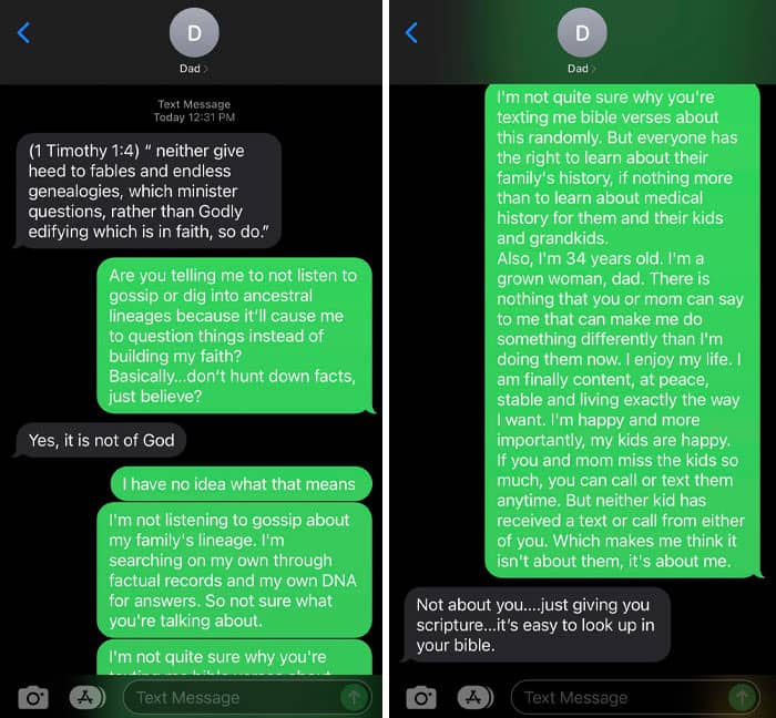 After doing AncestryDNA, my sister and I found out that we only have the same mother. After texting my mom about it in July, I never heard from her again. Never reached out to my dad. Then received these messages.