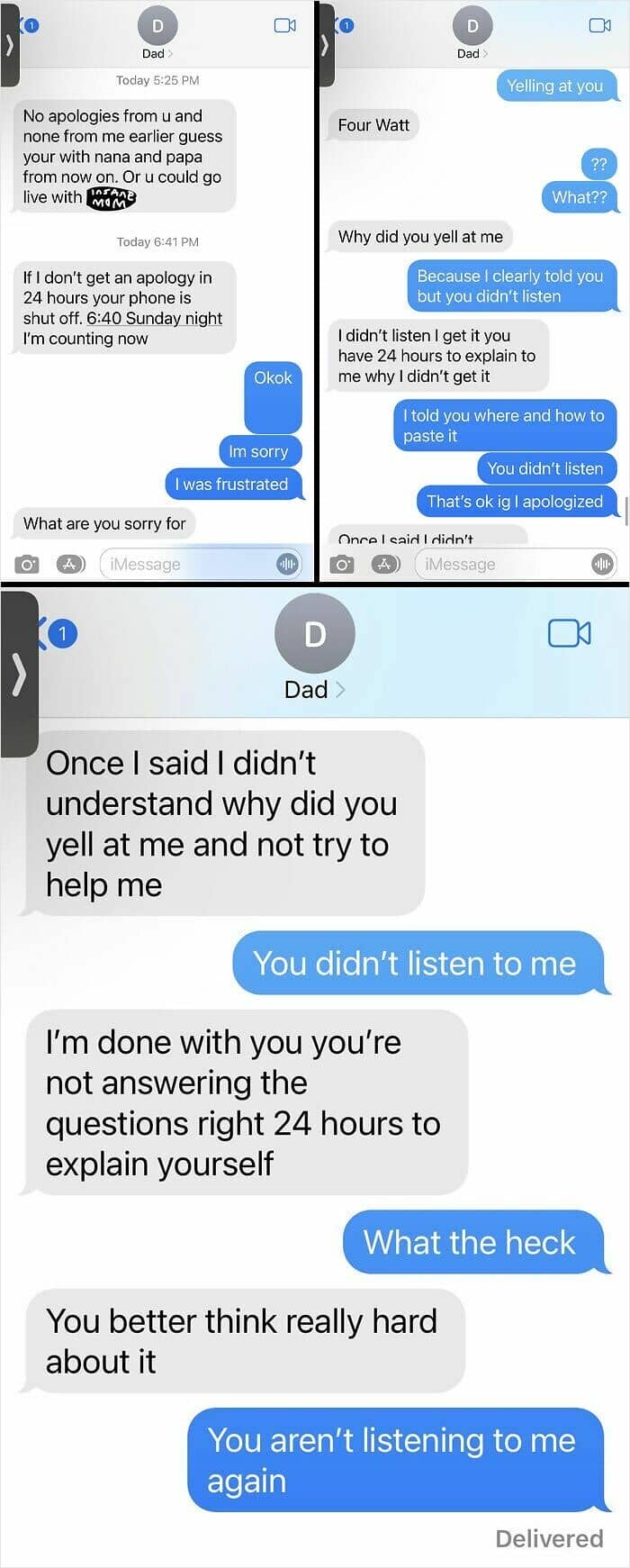 But my dad sent a very long response full of deflections and telling me to list all the things he’s done wrong as a parent, while asking 6 different times to talk in person.