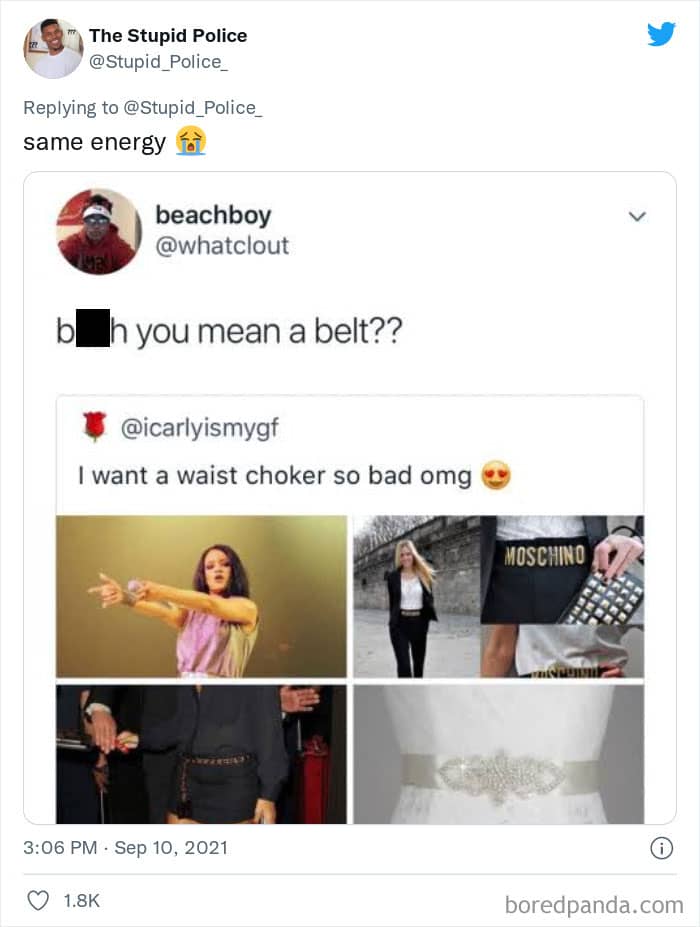 We reached out to the creator behind The Stupid Police Twitter page, which currently has 145.1K followers. “I was thinking about creating a gimmick account for a while so I went through and tried to think of ideas that haven’t been done before,” they told us. “This included cross-referencing viral tweets to find a similarity, looking through subreddits and searching through memes to find common similarities.”