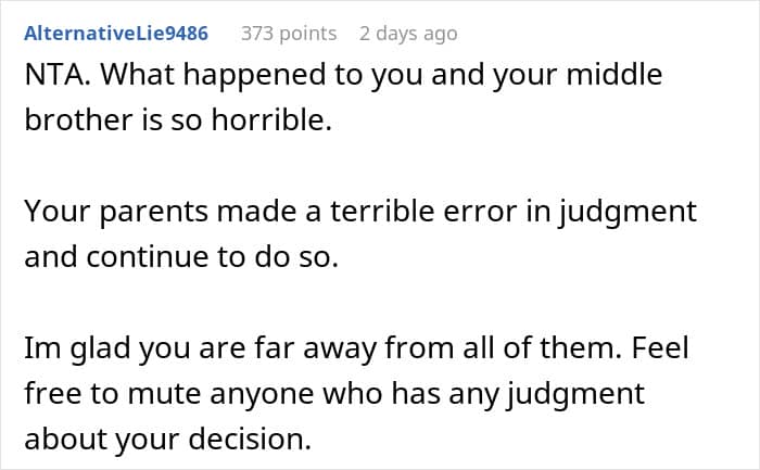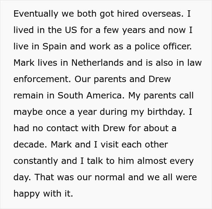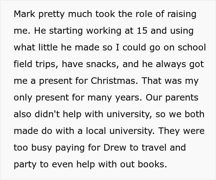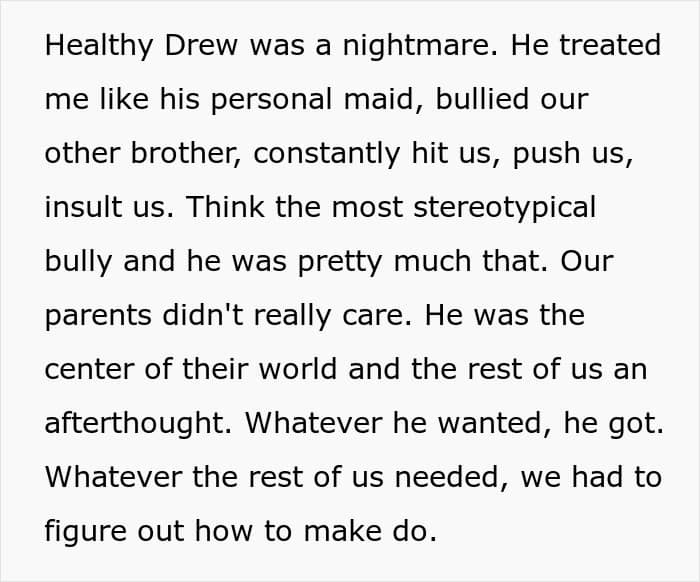 Meanwhile, Mark and the OP were essentially left on their own – their parents’ undivided attention was focused on the hospital room where Drew lived. There were procedures, doctors – but also the best gifts, gaming consoles, and whatnot. When Drew finally recovered at 14, his parents’ attitude didn’t change. He was a typical golden child, and his treatment of his younger siblings, alas, was just bullying.