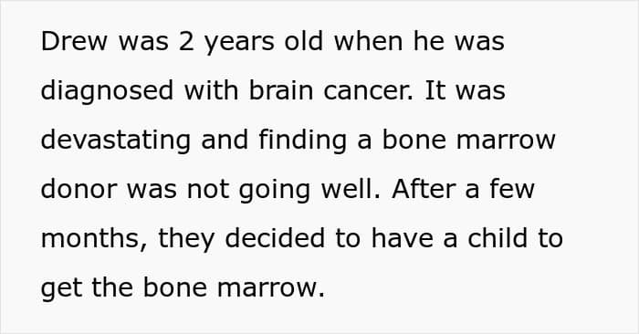 So, the Original poster (OP) explains that she is originally from South America and is the third child of her parents, after older brothers “Drew” and “Mark.” Both the author and Mark were essentially born with the sole purpose of saving their older sibling when he was diagnosed with cancer at age two.