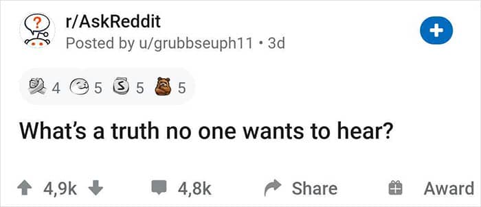 “What’s a truth no one wants to hear?” wondered Redditor u/grubbseuph11 on r/AskReddit and people shared some illuminating and brutally honest responses, like the hard-to-digest fact that “friends will come and go,” and that “no matter how likeable you may be, there are always going to be certain people who don’t like you, sometimes for no particular reason.”