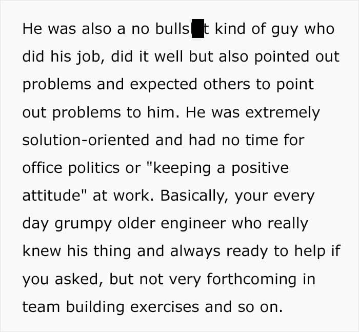 It begins by introducing the hero of the story. An elderly engineer who had become an integral part of the organization.