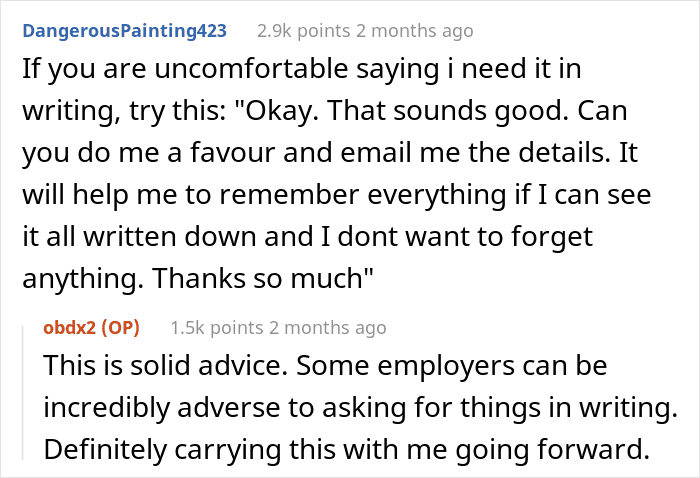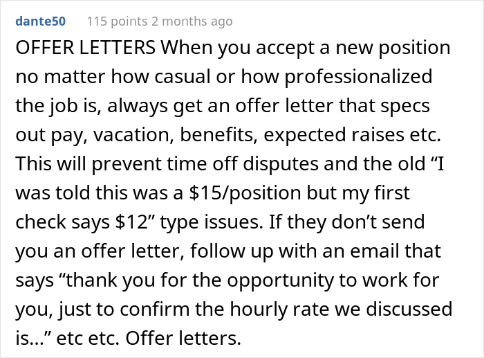 What redditor u/obdx2 said on r/antiwork absolutely holds true: you have to have things in writing. Your job description, the terms of your employment, your wage, and how much paid time off you get each year—these are just some of the things that should be clearly stated in your contract. You can’t operate merely on good faith in professional settings. Keeping a paper trail is essential, no matter what sector of the job industry you might find yourself in.