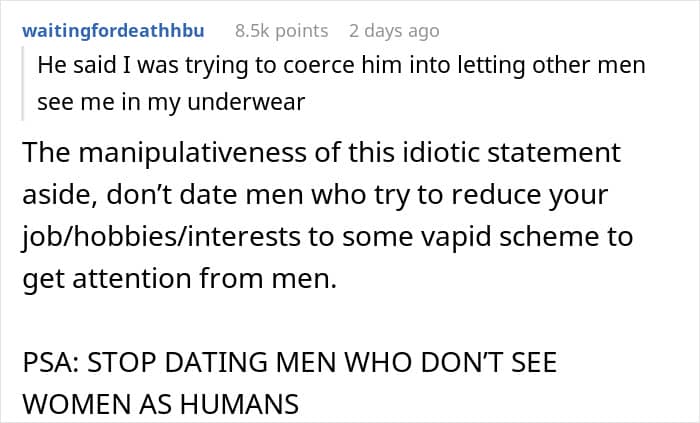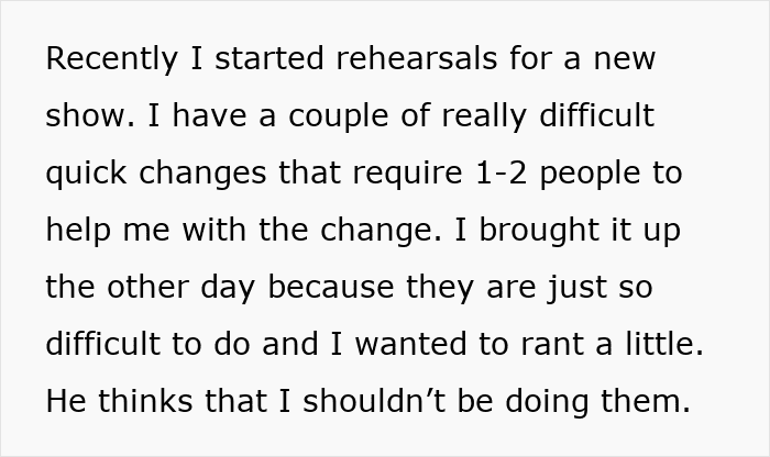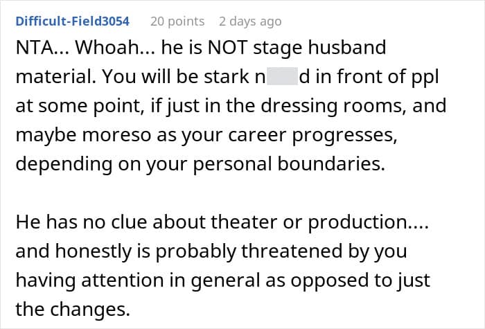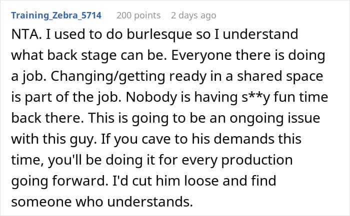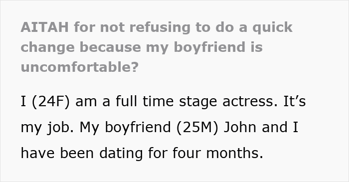 A woman asked the internet if she was wrong to tell her boyfriend that she will not be completing his demand that she not do backstage costume changes. Even though this was a decidedly not sensual experience, the presence of a male stage manager made him think that she simply should not do it.