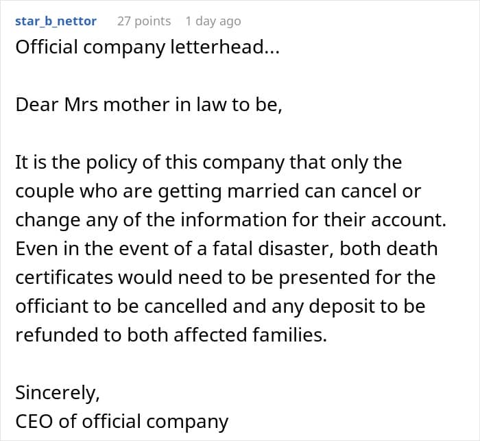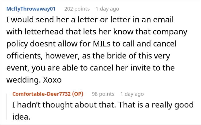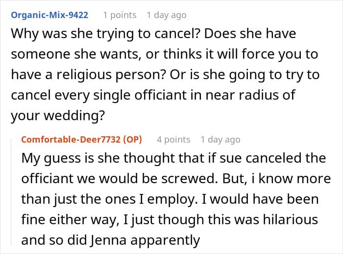 Luckily for the poster, her future mom-in-law didn’t know that her officiant was actually her employee. That’s how the OP and her husband got the inside scoop on all the meddling that his mother had done. They then decided to confront her and do something about her troublesome behavior.