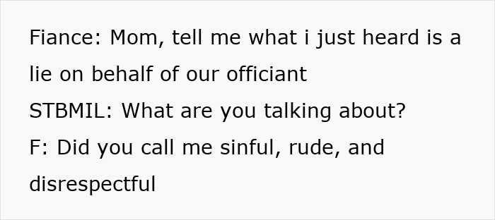 Unfortunately, in this case, the mother-in-law decided to go behind the OP’s back to talk to her officiant. She tried to convince the other woman that her future daughter-in-law was sinful, rude, and disrespectful, which was why she shouldn’t go through with officiating the wedding.