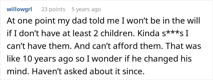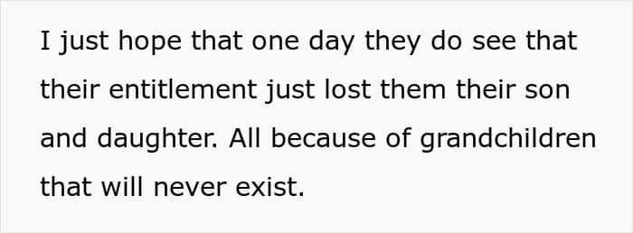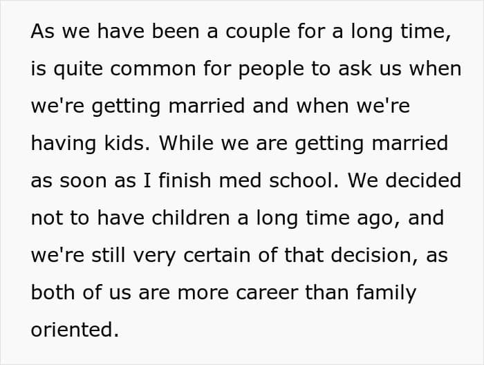 Like the parents of an engaged couple who refuse to accept that their adult kids want to remain child-free. Both the husband and the wife’s parents are demanding they have children, going as far as threatening to cut their inheritances should they not agree. The drama is unfolding just weeks before the couple’s wedding, and it’s cast a dark cloud over the plans.